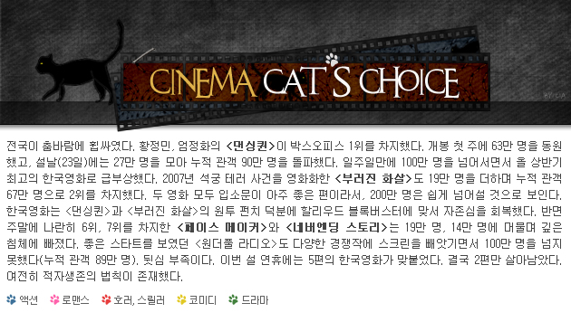 고양이 기지개: 법적 보호자가 필요한 육남매와 양아치 매니저가 가족으로 뭉쳤다. 이 전제만 봐도 답이 나온다. 또 웃고 울리는 가족영화다. 제목도 너무 뻔뻔하다. <파파>라니! 컨셉트와 타깃 층을 확실히 정했다. <헬로우 고스트>나 <과속스캔들>에 만족한 관객들에게는 충분히 소구할 가능성이 있다. 영화 스토리만 놓고 보면 설날 영화지만, 경쟁작들을 살짝 피했다. 그 결과는 봐야 알겠지만, 나쁘지 않은 전략이었다. 포장지는 박용우의 고생기처럼 보이지만, 뚜껑을 열어보면 고아라의 원맨쇼다. <원더풀 라디오>의 이민정에 도전장을 내민 신세대 로코퀸의 탄생!