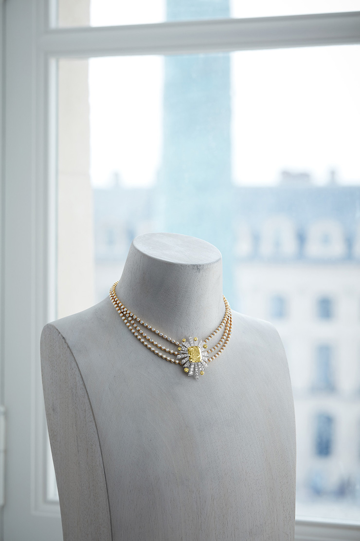 솔레이 19 웃트 네크리스. 22.10캐럿에 달하는 쿠션 컷 팬시 비비드 옐로우 다이아몬드가 특징.