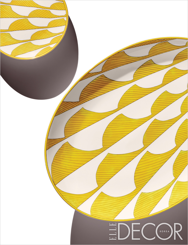 에르메스의 새로운 테이블웨어 ‘솔레일 데르메스(Soleil d’Herme‵s)’는 흰색 배경에 햇살처럼 따스하고 선명한 옐로의 기하학적 문양이 가미됐다. 에르메스 테이블웨어 크리에이티브 디렉터 베누아 피에르 에머리 후원 하에 일러스트레이터 아리엘 드 브리캄보(Arielle de Brichambaut)가 디자인했다. SOLEIL D’HERME`S