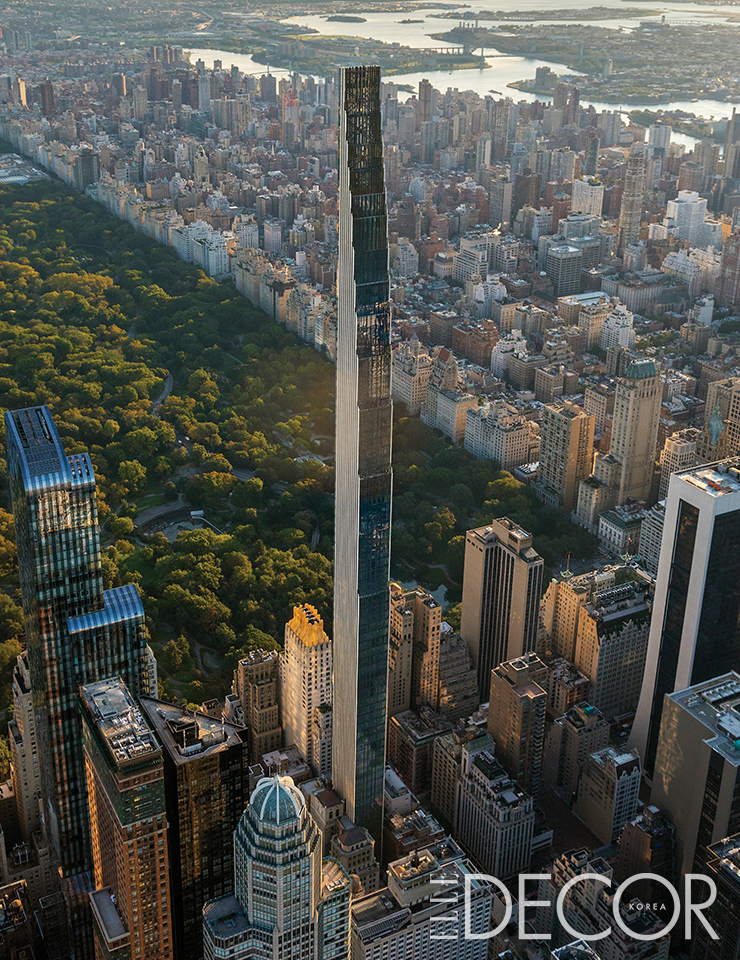 브루클린과 맨해튼, 시드니와 밀란까지, 대도시 건축에 일가견 있는 건축회사 SHoP 아키텍츠가 또 하나의 기념비적인 포트폴리오를 추가했다. 바로 센트럴 파크 중심에서 뉴욕 상공을 날카롭게 찌르는 435m 높이의 ‘111 West 57th Street’. JDS 부동산개발그룹이 매입한 유서 깊은 ‘스타인웨이 홀(Steinway Hall)’을 증축하는 방식으로 지어졌으며 총 60개의 레지던스에 입주가 진행 중이다. 114 WEST 57TH STREET