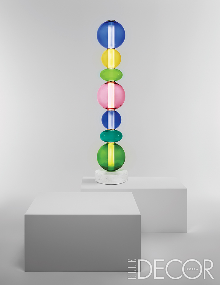 여행 철학을 바탕으로 영감 넘치는 디자인을 선보여온 루이 비통 오브제 노마드 컬렉션에서 과감하고 현대적인 비전을 발견한다. 오브제 노마드 컬렉션의 신작 중 하나인 스튜디오 루이 비통의 토템 조명은 카프리 옐로, 캐리비언 그린, 베네치언 루비, 피코크 블루, 에메랄드 그린 총 다섯 가지 컬러의 유리 구형 일곱 개로 이뤄진다. 이탈리아 무라노(Murano) 지역의 유리공예 장인들이 수작업 블로잉 방식으로 아름답게 제작한 유리 구형은 구체마다 금으로 도금한 황동 링으로 고정한다. 견고한 대리석 기반 위에 놓인 LED 기둥은 구체를 통해 따스하고 우아하게 굴절된 빛을 비춰낸다. TOTEM LUMINEUX
