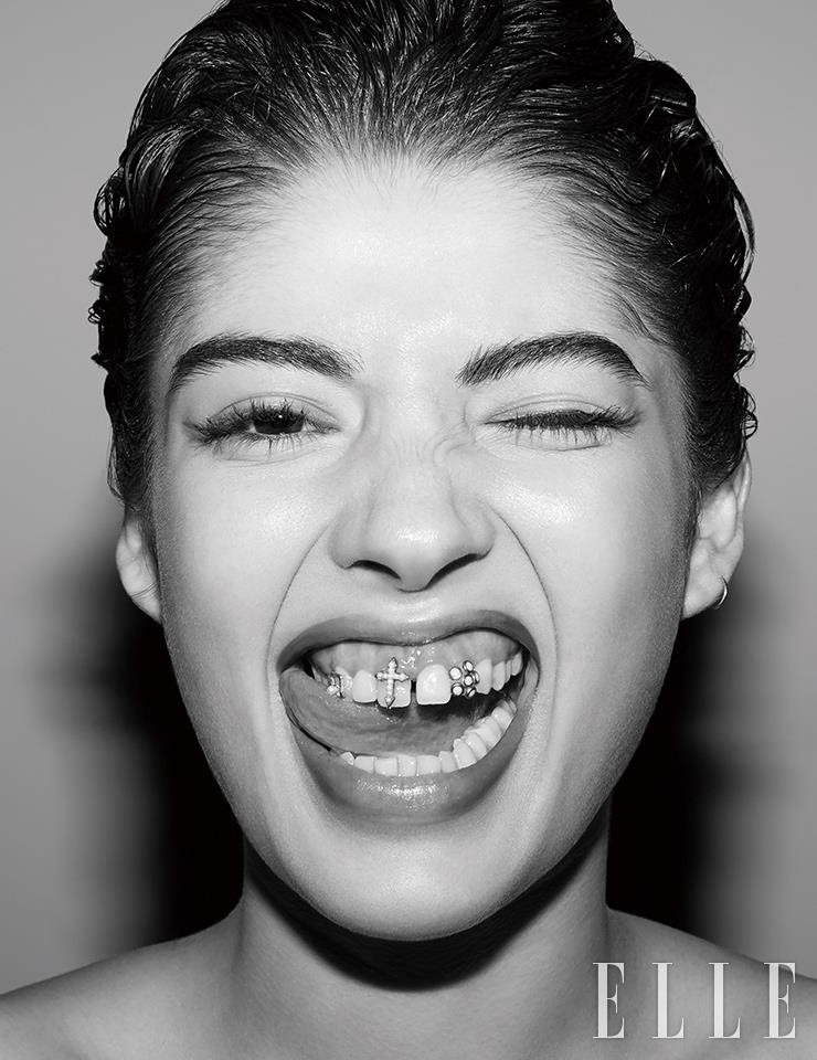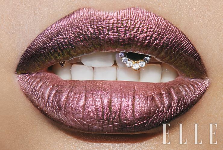 메탈릭한 질감이 돋보이는 립스틱을 풀 립(Full lip)으로 대담하게 바른 뒤, 입술 사이로 강렬한 존재감을 자랑하는 큼지막한 투스 젬을 위쪽 치아에 부착했다. GO METALLIC