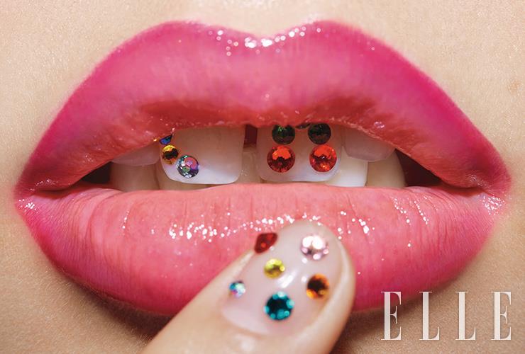 한여름의 페스티벌 무드와 맞물려 다시금 이목이 집중되는 ‘투스 젬(Tooth Gem)’ 트렌드. 아무리 스티커 붙이듯 간단해 보여도 치아에 손상을 가하지 않은 채 오래 유지하기 위해서는 교정 브라켓을 붙이는 것과 동일한 과정을 거쳐야 한다. 반드시 치과에서 전문가의 도움을 받을 것. 립 메이크업을 할 땐 투스 젬과 일관된 느낌으로 연출하고, 네일에도 비슷한 느낌으로 포인트를 가미해 보자. MATCHY MATCHY