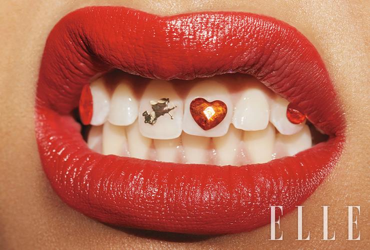 작은 치아 안에 당신만의 이야기를 창조해 보자. 하트 모양의 투스 젬을 붙인 치아 옆에 작은 큐피드 스티커를 붙인 화보 속 레드 립의 주인공처럼! CREATE YOUR OWN STORY