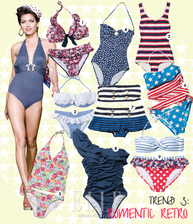 1 러플 디테일 플라워 비키니. 5만9천원. 발리비키(www.balibiki.net). 2 아일릿 레이스 비키니. 5만3천원. 배드마마자마. 3 플라워 홀터넥 비키니. 20만원대. 보그너. 4 들꽃 프린트 원피스 수영복. 5만9천원. 액세서라이즈. 5 레트로 스트라이프 수영복. 가격 미정. 마크 by 마크 제이콥스. 6 별과 스트라이프 프린트 수영복. 가격 미정. 아디다스 오리지널스 by 제레미 스콧. 7 스트라이프 비키니. 30만원대. 쥬시 꾸뛰르. 8 원 숄더 러플 데님 수영복. 34만8천원. 질스튜어트 햄튼 라인. 9 스트라이프 & 도트 비키니. 15만9천원. EnC.