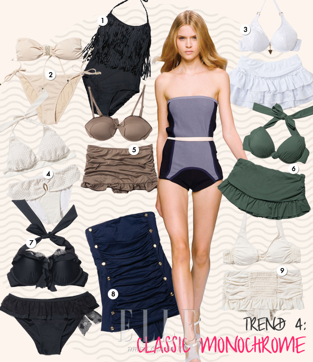 1 프린지 장식 수영복. 2만8천8백원. 포에버 21. 2 누드 톤 튜브 톱. 9천원. 브리프. 1만원. H&M. 3 레이스 화이트 비키니. 4만7천원. 발리비키. 4 화이트 니트 비키니. 11만5천원. 레노마 Swim & Gym. 5 다크 베이지 비키니. 4만5천원. 발리비키. 6 카키 홀터넥 비키니. 29만8천원. 쥬시 꾸뛰르 햄튼 라인. 7 레이스 프릴 디테일 비키니. 12만5천원. 레노마. 8 네이비 원피스 수영복. 30만원대. 쥬시 꾸뛰르. 9 화이트 홀터넥 비키니. 30만원대. 쥬시 꾸뛰르.