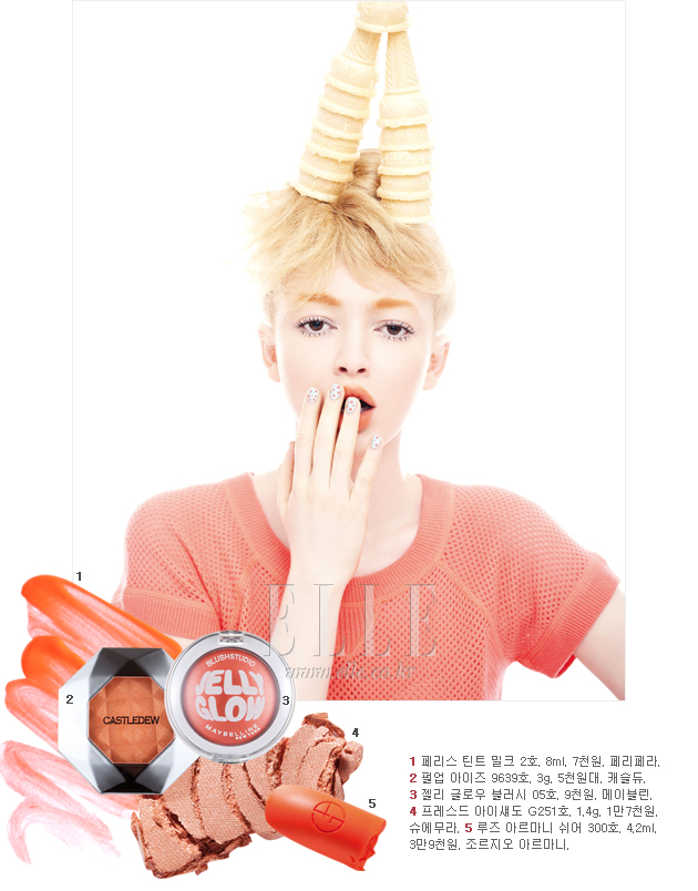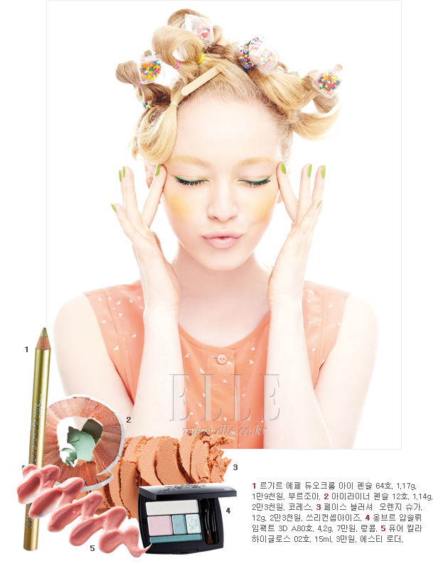 jade green 비치나 옥처럼 고귀한 보석에서 나는 제이드 그린은 바다 빛깔과 닮아 여름과 특히 잘 어울리는 컬러다. 멋지게 소화하는 방법은 나스의 펜슬 라이너 칼리스테 컬러를 사용해 아이라인을 길게 빼서 그린 후 언더라인의 중간부터 꼬리까지 한 번 더 이어 바르는 것. 그런 다음 슈에무라 P 소프트 오렌지 컬러를 볼 안쪽으로 둥글게 펴 바르고, 누드 톤의 디올 어딕트 립스틱 326호를 입술에 발라주기만 하면 귀엽고 사랑스러운 분위기가 한결 살아난다.