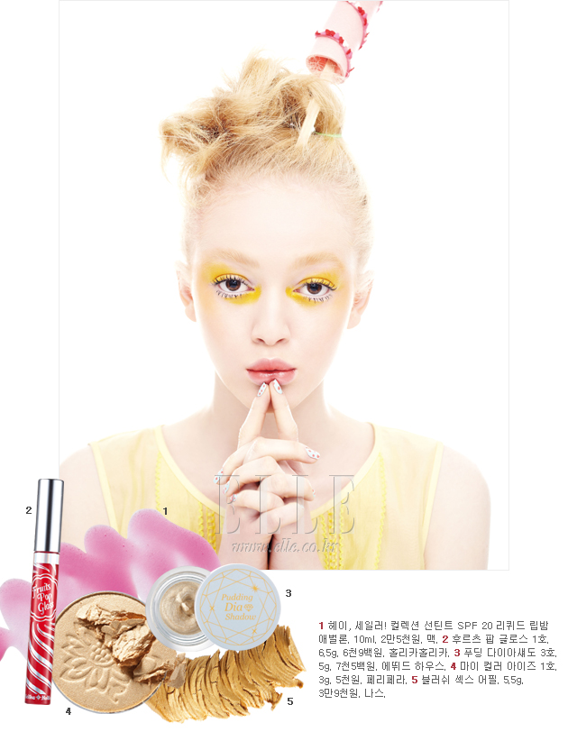 light yellow 옐로 컬러 아이섀도는 피부 톤이 어두운 여성보다 비교적 흰 여성에게 추천할 만하다. 간편한 연출법은 메이크업 포에버 아쿠아 크림 25호를 눈 앞머리에서부터 언더로, 눈두덩의 뒷부분에서 앞으로 그러데이션한 뒤 디올쇼 뉴룩 마스카라를 촘촘히 칠해 왕관 모양 속눈썹을 연출하는 것. 그런 다음 입술에 나스 립글로스 오달리스크를 입술 안쪽에서 바깥쪽으로 그러데이션하면 바닷가와 수영장에서도 기죽지 않을 싱그러운 바캉스 메이크업이 완성된다.