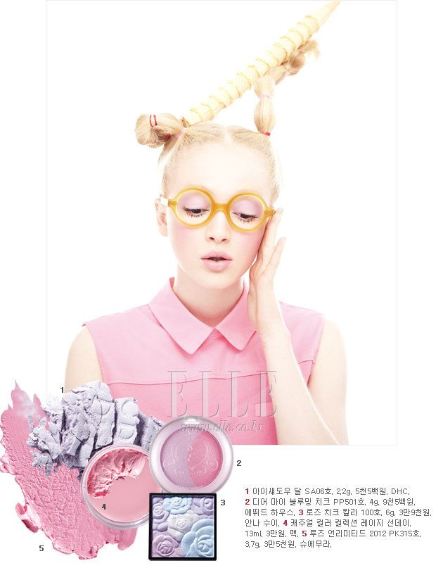 soft lavender 포근한 느낌의 라벤더 컬러 아이섀도를 잘 바르기 위해서는 컬러 선택과 부위 선정이 가장 중요하다. 펄감이 느껴지는 밝은 컬러 또는 아예 진한 색깔을 고르는 게 안전한데, 슈에무라의 매화 팔레트 IR715호처럼 연한 색깔을 골랐다면 눈두덩에 넓게 펴 바른 뒤 크리스챤 디올의 가든 클러치 002호 페일민트 컬러를 눈 앞머리에 덧발라 눈매를 환하게 밝혀준다. 그리고 맥의 크림 블렌드 블러셔 리즈토어스 머즐 컬러를 볼에 자연스럽게 펴고 랑콤의 루즈 인 러브 립스틱 34B를 손가락에 묻혀 입술에 톡톡 두드려 발라주는 것. 톱. SJSJ.