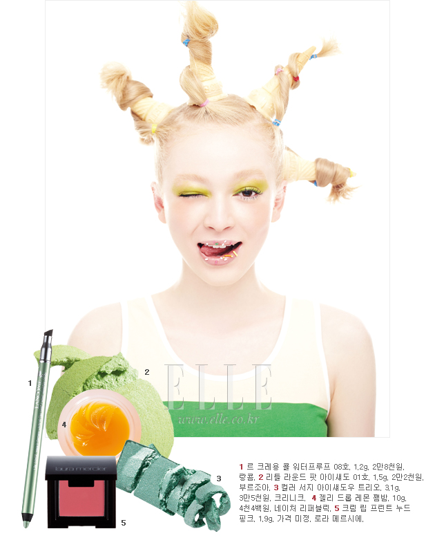 lime green 라임 그린은 오렌지 또는 옐로 컬러와 가장 잘 어울리는 컬러로 아이섀도, 블러셔와 맞춰 바르면 한결 자연스럽고 예쁘다. 가령 맥의 페인트 팟 퓨어 크리에이션 컬러를 라이너 브러시에 묻혀 아이라인을 살짝 올려 그린 후 랑콤의 이프노즈 돌 아이 마스카라로 속눈썹을 한올 한올 쓸어 올린다. 이어서 크리스챤 디올의 로지 글로우 헬씨 글로우 어웨이크닝 블러셔를 볼에 둥그렇게 굴려가며 펴 바르고, 맥의 샵 맥 컬렉션 노티 소떼 컬러를 입술에 은은하게 발라주는 것.
