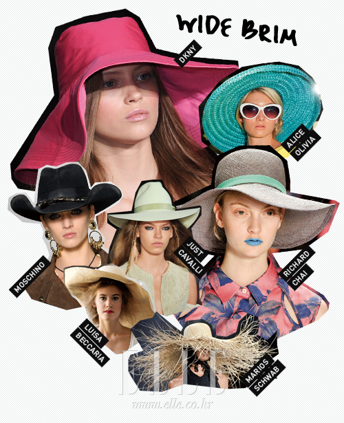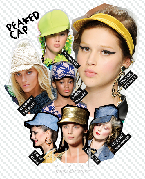 PEAKED CAP 야구, 수영, 레이싱, 하이킹 등 다양한 스포츠에서 모티브를 얻은 스포티즘 패션을 가장 쉽고 빠르게 즐길 수 있는 법은? 챙이 뾰족한 캡을 선택하는 것! 올여름에는 칵테일 드레스 위에 야구 모자를 매치해 천방지축 말괄량이 소녀로 변신하거나, 라피아 소재를 촘촘하게 엮은 모자로 에코 패션을 시도해보자. 조금 더 특별한 캡을 찾는 걸들에게는 유니크와 카렌 워커 컬렉션에서 선보인 캡 위에 다양한 디테일을 더한 스타일을 추천한다. 앞서 소개한 야구 모자 스타일의 캡과 더불어 주목받고 있는 건 일명 ‘아줌마 햇빛 가리개’로 통하는 선바이저. 스트라이프 티셔츠, 맨투맨 티셔츠 등에 PVC 소재의 컬러풀한 선바이저만으로 에너지 넘치는 서머 룩을 연출할 수 있을 것이다. |