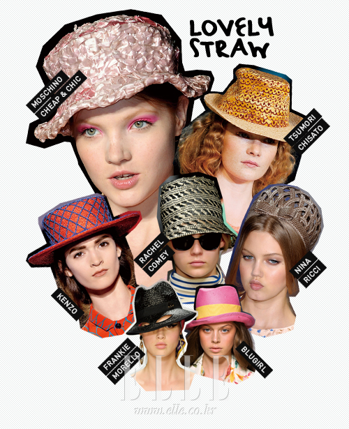 LOVELY STRAW ‘여름’ 하면 가장 먼저 떠오르는 밀짚 소재 스트로 해트는 누구라도 손쉽게 활용할 수 있는 스마트한 아이템이다. 그중에서도 메리 포핀스를 떠올리게 하는 정수리가 눌린 보터 해트는 여러 쇼에서 두각을 나타내며 걸들이 탐낼 만한 아이템으로 등극했다. 은은한 파스텔 컬러를 입혀 여성스러운 보터 해트를 대거 선보인 존 갈리아노와 그물망을 씌운 보터 해트를 매치해 유니크한 쇼를 선보인 겐조 쇼에서 알 수 있듯, 보터 해트는 매니시 룩의 단골 아이템이었던 페도라를 대신할 만한 메가톤급 아이템으로 급부상한 것.