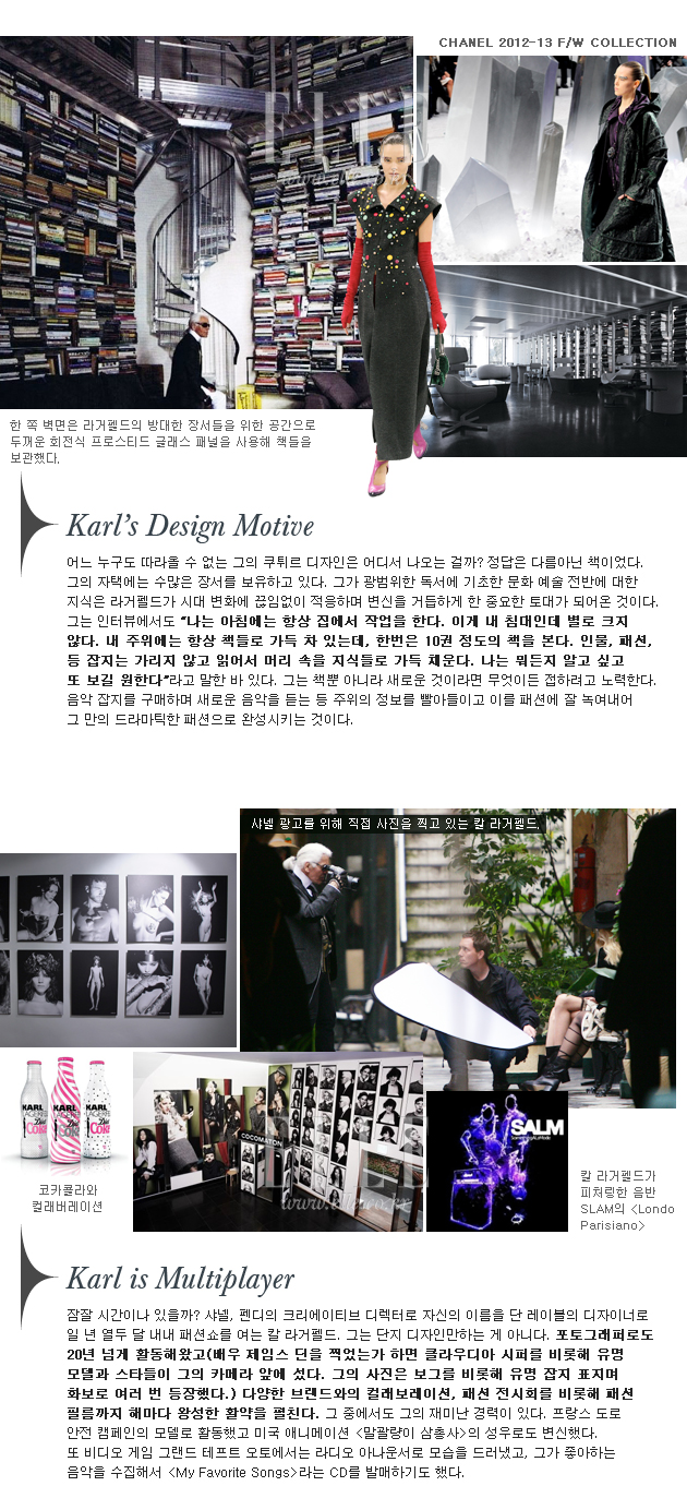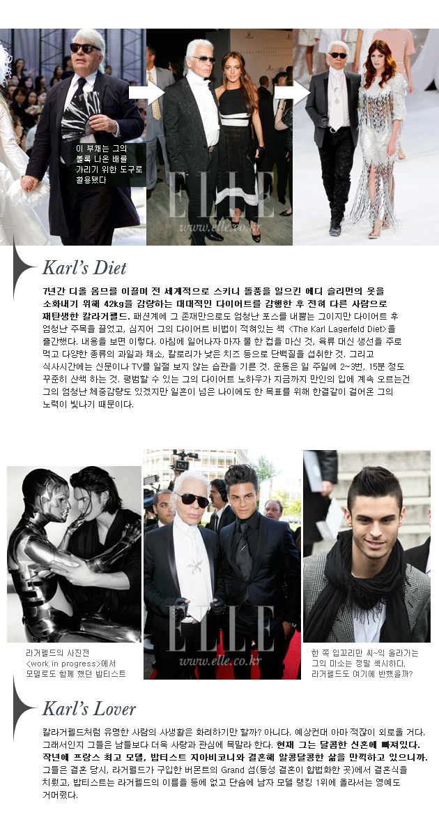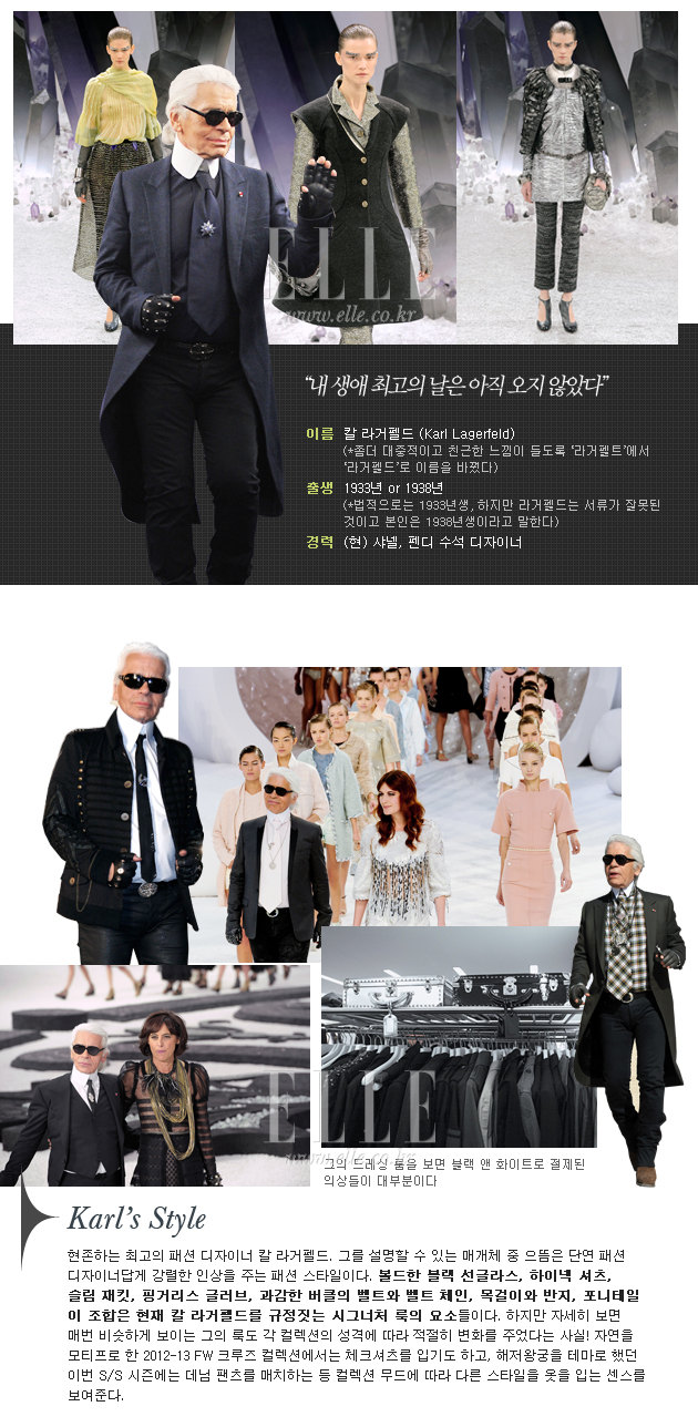 패션 브랜드 샤넬과 펜디 그리고 자신의 이름으로 전개하는 브랜드까지. 최고의 패션 디자이너라는 찬사가 아깝지 않은 칼 라거펠드. 혹시 그를 생각하면 떠오르는 키워드가 있는가? 블랙 스타일과 다이어트, 그리고 멀티플레이어 등 그와 관련된 키워드로 지극히 사적인 이야기를 풀어보려한다.