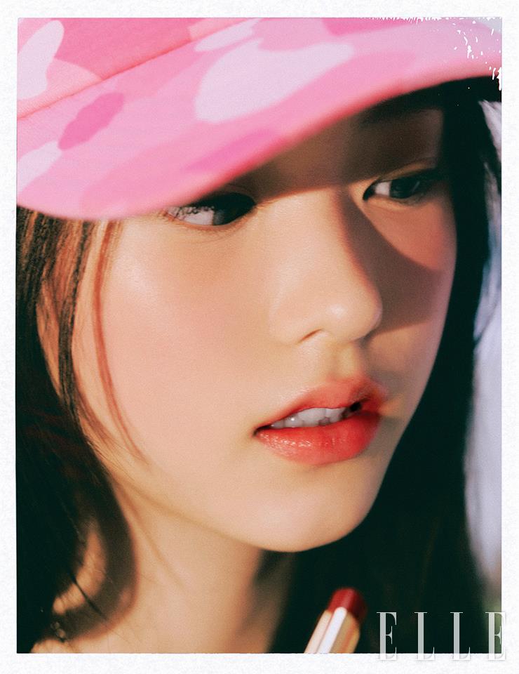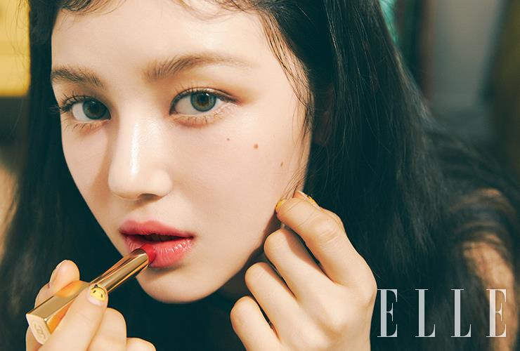 해린의 양 볼에 핑크빛 혈색을 더한 블러셔는 크리미한 질감의 N°1 DE CHANEL 레드 까멜리아 립 앤 치크 밤, 5 라이블리 로즈우드. 그 다음 버건디빛이 가미된 레드 톤의 루쥬 알뤼르 렉스트레, 868호를 입술 가운데 중심으로 두드려 색을 입혀줬다. 사용 제품은 모두 Chanel. 미니 체인 백과 네크리스는 모두 Chanel. 니트 톱과 핑크 쇼츠, 니 삭스와 모자, 플랫폼 스니커즈는 모두 스타일리스트 소장품.