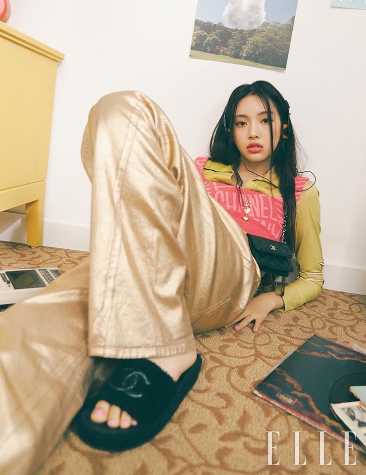 시원시원한 이목구비의 혜인. 레 꺄트르 옹브르, 308 끌레르-옵스뀌로 음영을 드리운 눈가에 스틸로 이으 워터프루프, 52 뀌브르 도레로 점막을 따라 코퍼빛의 포인트를 부여한다. 양 볼에 N°1 DE CHANEL 레드 까멜리아 립 앤 치크 밤, 2 헬시 핑크를 터치하고, 루쥬 알뤼르 렉스트레, 854호를 입술에 발라 레드 톤을 가미한다. 사용 제품은 모두 Chanel. 핑크 크롭트 톱과 미니 체인 백, 암 커프스와 슬리퍼, 네크리스는 모두 Chanel. 레이어드한 그린 톱은 스타일리스트 소장품. 골드 메탈릭 팬츠는 lumarine.
