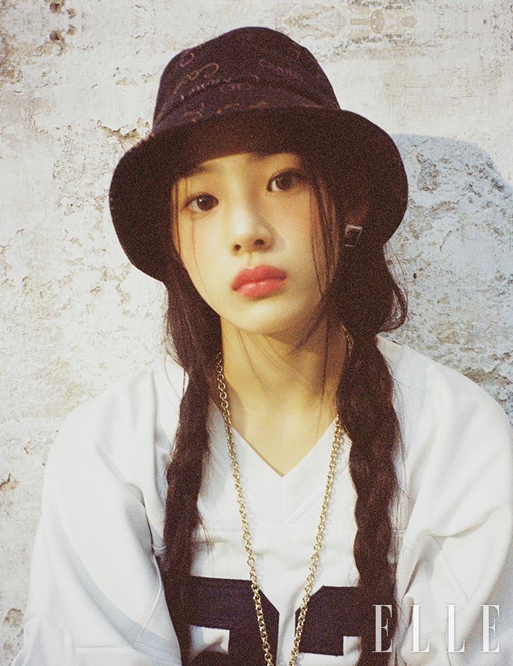 N°1 DE CHANEL 레드 까멜리아 파운데이션을 소량만 얇게 발라 민지의 얼굴에 생기를 표현한 뒤, 레 베쥬 헬시 글로우 내추럴 아이섀도우 팔레트, 웜으로 눈가에 음영을 더한다. 입술에 루쥬 알뤼르 렉스트레, 844호를 바르고 손끝에 립스틱을 묻혀 양 볼에도 톡톡 터치. 사용 제품은 모두 Chanel. 데님 햇과 이어링, 네크리스는 모두 Chanel. 박시한 톱은 스타일리스트 소장품.