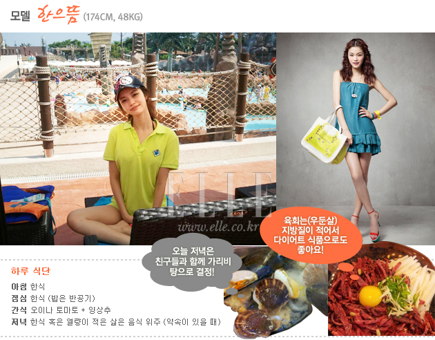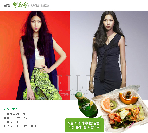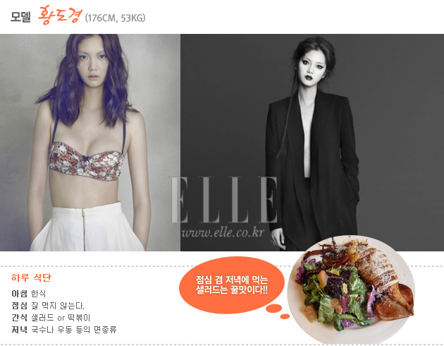 체질 뼈는 얇지만 지방과 근육이 잘 붙는 체질 살이 쪘을 때 다이어트 노하우 식탐이 많아서 오히려 먹고 싶은 것을 못 먹을 때는 스트레스로살이 더 찐다. 때문에 먹고 싶은 게 있으면 먹긴 먹되 배가 부르다는 신호가 오면 바로 숟가락을 내려놓는다. 그리고 열량소비를 위해 생활 속 다이어트를 실천하는 편. 즉 한두 정거장 정도는 버스 타지 않고 걷기, 바른 자세로 앉기(등을 구부리고 앉는 자세는 복부비만의 원인 중 하나다). 자세만 바로잡아도 근육의 긴장으로 칼로리가 소모된다. |