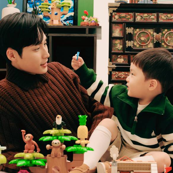 레고 꽃다발과 생화를 믹스해 완성한 레고 정원, 취향에 따라 컬러와 디자인을 선택해 아트 작품을 완성할 수 있는 플라워 아트 액자는 모두 LEGO. 원피스는 Bmuet(te).