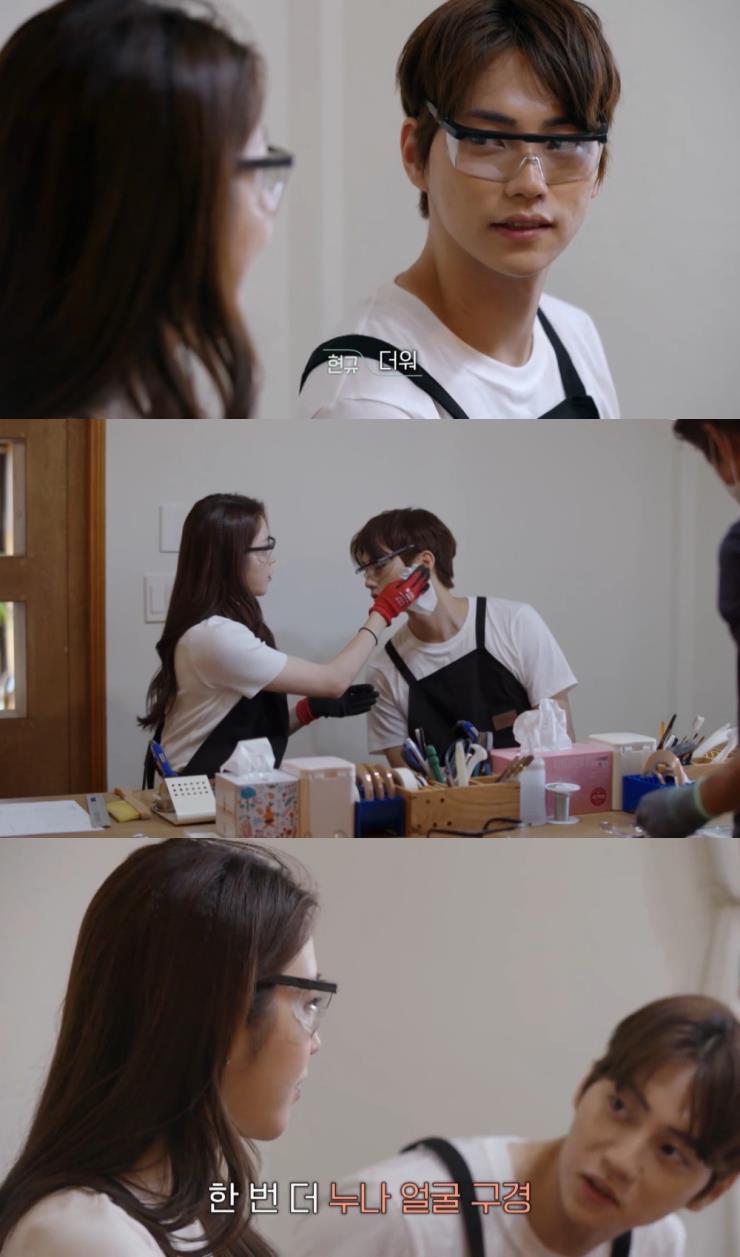 이튿날 현규와 해은은 유리공방 데이트에 나섰습니다. 유리로 도어벨을 함께 만드는 체험을 했는데요. 현규는 다소 두껍게 옷을 입고 있어서였는지 땀을 흘리기 시작했습니다. 카디건을 벗는 현규를 보던 해은이 휴지로 오른쪽 뺨에 맺힌 땀을 닦아 줬는데요. 그러자 현규는 자연스럽게 "더워"라고 말하며 다른 쪽 뺨을 내밀었어요. 요망 그 자체인 모습에 스튜디오에서 지켜 보던 패널들도 "진짜 보통이 아닌 녀석이 들어왔다"라며 혀를 내둘렀습니다.