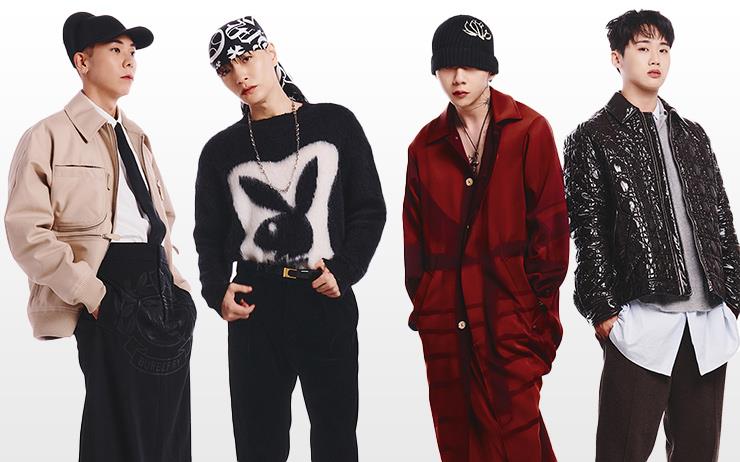 쿠기가 입은 재킷과 니트, 재킷과 팬츠는 모두 Dior. 로꼬가 입은 재킷과 스커트, 셔츠와 타이, 모자는 모두 Burberry. 우원재가 입은 롱 재킷과 팬츠는 모두 Jiyongkim. 사이먼 도미닉이 입은 니트 풀오버는 Rick Owens. 헤드 스카프는 Chrome Hearts.