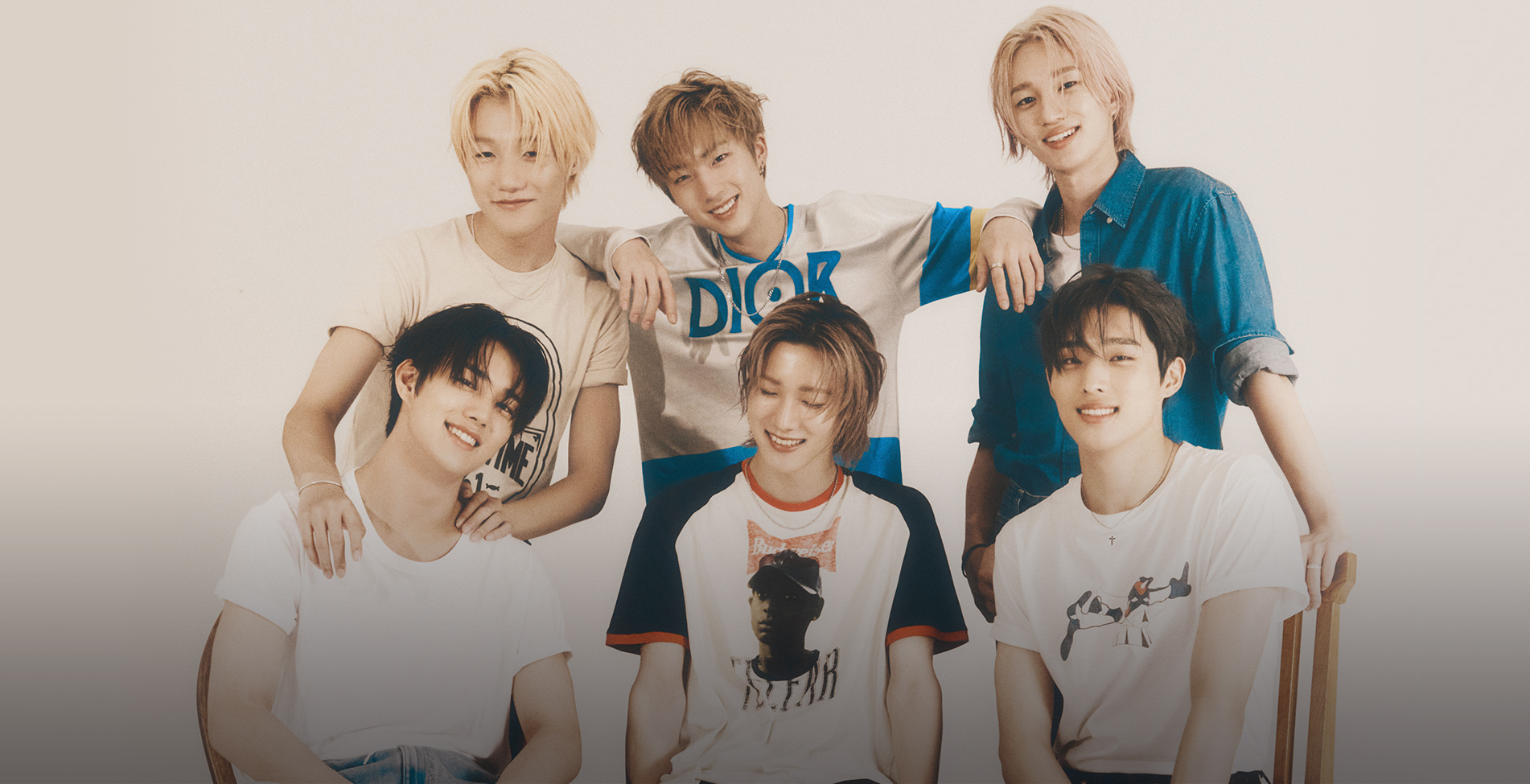 (왼쪽 위부터 시계 방향으로) 종섭이 입은 티셔츠는 Mitchell and ness by Fredsegal. 팬츠는 Levi's. 슈즈는 Converse. 팔찌는 Ille Ian. 지웅이 입은 톱과 팬츠, 슈즈는 모두 Dior Men. 테오가 입은 데님 셔츠는 Club Monaco. 팬츠는 Wooyoungmi. 슈즈는 Converse. 팔찌는 The Rovers Jewelry. 기호가 입은 톱과 액세서리는 스타일리스트 소장품. 팬츠는 Levi's. 슈즈는 Converse. 소울이 입은 티셔츠는 스타일리스트 소장품. 팬츠는 Studio Guage. 슈즈는 Converse. 인탁이 입은 셔츠는 Noice. 슈즈는 Converse. 팔찌는 Initial Accessory.