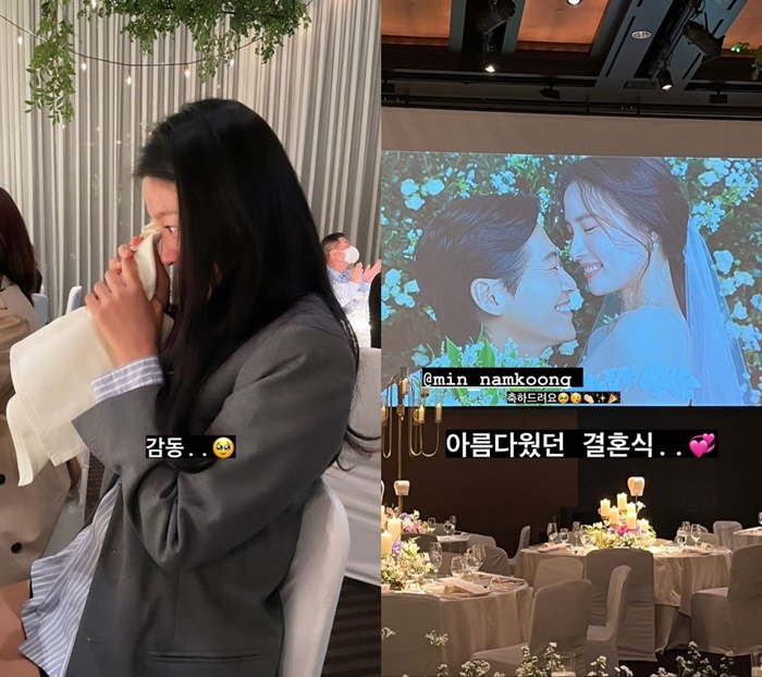 특히 2년 전 tvN <낮과 밤>에 같이 나왔던 설현은 인스타그램에 현장 사진을 게재했는데요. 식장 내 스크린에 상영 중인 부부의 영상을 올리며 "아름다웠던 결혼식"이라는 코멘트를 다는가 하면, 냅킨으로 눈물을 훔치는 자신의 모습과 "감동"이라는 짧은 글을 적기도 했습니다. 이날 결혼식에는 남궁민이 진아름에게 프러포즈하는 영상도 공개됐다고 하는데요. 적잖이 감동적이었던 모양이네요.