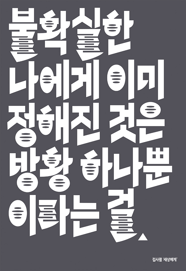 특별한 이유가 있다기보다는 내게 가장 익숙하고 편안한 도구를 활용하는 것이 가장 잘 쓸 수 있지 않을까. 내가 쓰는 언어 이외에 가진 자원이 풍부한 사람은 아니다. 한정적인 자원으로 작품을 완성하는 것이 가장 자연스러워 보일 테다. 그래서 단어나 표현을 어렵게 쓰지 않는 편이다. 한글로 구성된 타이포그래피 작업이 아주 기대된다.