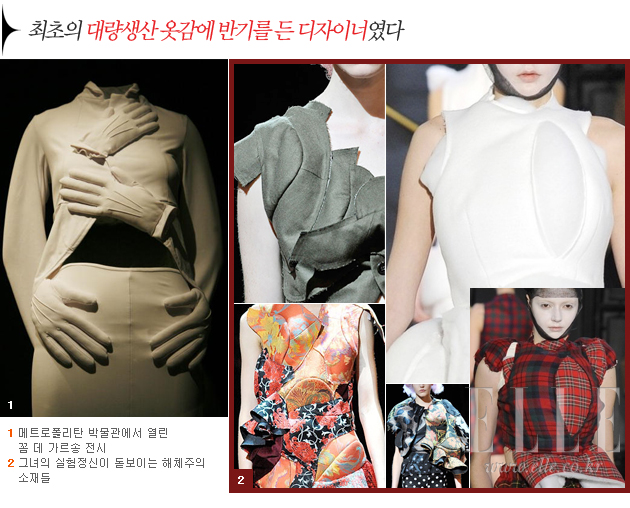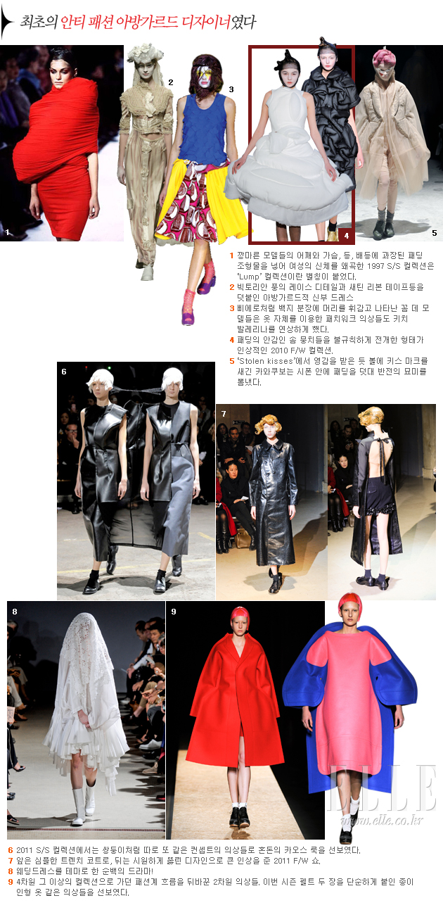 레이 카와쿠보는 글래머러스하고 아름다운 패션이 주를 이뤘던 파리를 강타한 핵폭탄과 같은 존재였다. 너덜너덜하고 찢어진 의상들은 혹평을 받았지만 그녀는 굴하지 않았다. 마침내 패션계는 카와쿠보의 새로운 패션 미학의 놀라움을 발견했고 그 전위적인 의상들에 빠져들었다. 지금도 그녀의 전위적인 의상들은 한마디로 정의하기 어렵다. 인터뷰에 당최 나타나지 않는 그녀가 한 마디 내뱉은 말을 되뇌며 컬렉션을 보고 해석한다. 꼼 데 가르송은 곧 레이 카와쿠보 자신이며, 컬렉션, 매장, 그 외의 모든 것은 그녀를 표현하는 분신과 같다. 현재 아방가르드 패션 철학의 명맥을 소신 있게 이어가고 있는 앤트워프 3인, 마틴 마르지엘라, 앤 드뮐미스터, 드리스 반 노튼은 모두 레이 카와쿠보의 영향에서 비롯됐다고 볼 수 있다. 이렇듯 최고의 디자이너들에게 영감이 되며 진정한 패션의 선구자라 불리고 있다. |