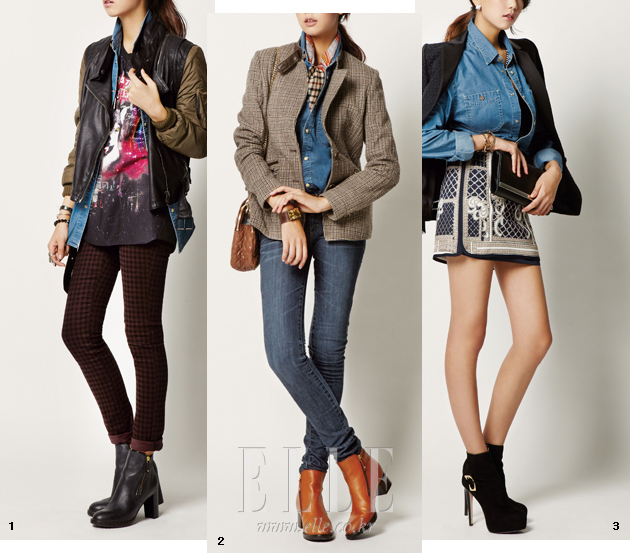 2 클래식한 브리티시 체크 재킷. 60만원대, 닥스 레이디스. 체크 프린트 스카프. 25만5천원, 닥스 레이디스. 블루 데님 팬츠. 23만8천원, 게스 진. 브라운 컬러 퀼팅 백. 80만원대, 미샤. 브라운 컬러 앵클부츠. 56만5천원, 라코스떼 by 플랫폼. 가죽 브레이슬릿. 20만원대, CC스카이.