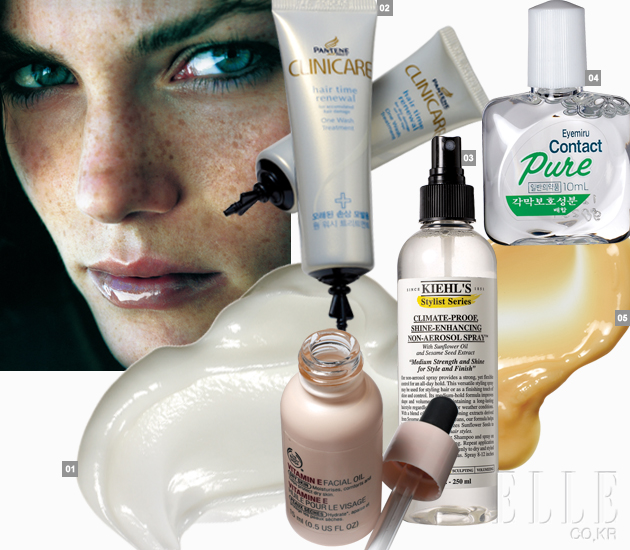 1 오리진스 리치 리워드. 손상된 두피와 모발을 진정사키고, 염증을 예방한다. 3만원. 2 팬틴 클리니케어 원워시 트리트먼트. 손상된 모발과 두피를 위한 헤어 마스크. 10개입. 1만2천9백원. 3 키엘 클라이밋 프루프 샤인 인핸싱 논 에어로솔 스프레이. 건조한 모발에 윤기를 더해준다. 2만1천원. 4 장시간 컴퓨터 사용, 독서 후 예민해진 눈가를 위한 인공누액. 5 케라스타즈 올레오 릴렉스 마스크. 정전기, 건조함을 예방하는 헤어 마스크. 6만1천원.