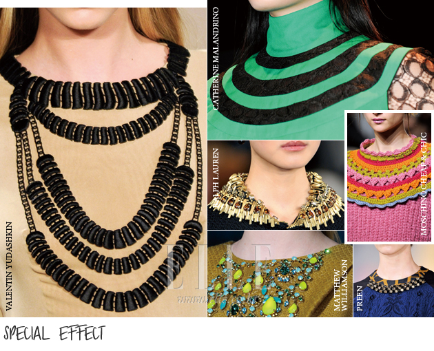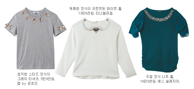 | 시간이 없어서, 방법을 몰라서, 귀찮아서 등 다양한 이유를 빌미로 올인원 제품을 즐겨 사용하는 걸들에게 희소식 하나! 무거운 목걸이를 주렁주렁 걸치지 않아도 목걸이를 한 것 같은 효과를 누릴 수 있는 일석이조의 페이크 칼라 의상이 대거 쏟아져 나왔다는 것이다. 그중 가장 대표적인 페이크 효과는 바로 호사스러운 큐빅 장식의 네크라인 의상. 랄프 로렌, 마리오 슈왑, 프린 등 수많은 컬렉션에서 쇼의 완성도를 높여주는 조력자 역할을 톡톡히 해내며 그 입지를 단단히 굳히고 있는 모습이다. 별다른 액세서리 없이도 반짝반짝 빛나는 컬러 스톤과 시퀸 비딩의 네크라인 의상은 마치 특별한 화이트닝을 한 것처럼 얼굴을 환하게 밝혀줄 테니 올가을 쇼핑 리스트에 꼭 추가하도록. 발렌틴 유다스킨과 모스키노 칩 앤 시크 컬렉션에서 선보인 자수와 크로셰 니트 장식 효과도 눈여겨보자. 오랜 시간 착용하면 묵직한 무게 탓에 피로감이 몰려오는 큐빅 장식과 달리 깃털처럼 가벼울 뿐 아니라 전체적인 프러포션을 더 길어 보이게 하는 효과를 누릴 수 있다. |