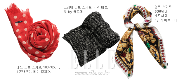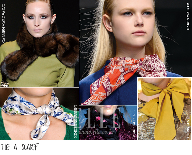 | 올 상반기 가장 두드러진 활약을 펼친 액세서리는 잇 백이나 잇 슈즈가 아닌 스카프였다. 스카프의 모든 것을 보여주겠다는 듯 쇼장을 온통 스카프 전시장으로 물들인 D&G부터 에르메스 컬렉션까지 형형색색 화려한 스카프의 무한 변주가 펼쳐졌기 때문. 이번 시즌에는 스카프가 한층 정갈하고 단정한 모습으로 선보였다. 스타일링법은 크게 3가지로 요약할 수 있는데 첫 번째는 카렌 워커와 크리스 벤츠 컬렉션에 등장한 리본 만들기다. 가로로 긴 스카프를 목에 두르고 리본 매듭을 지으면 사랑스러운 가을 여자로 변신할 수 있을 듯. 메가톤급 트렌드인 매니시 무드에 동참하고 싶은 걸들은 에르메스와 알투자라의 컬렉션을 참고하자. 얇고 긴 스카프를 루스하게 목에 감은 후 넥타이 클립으로 마무리하거나 스카프를 두 번 접어 짧게 겹치면 보이시한 루킹을 완성할 수 있을 것이다. 턱 라인이 둔탁하다면 마크 제이콥스와 세린느에서 선보인 스카프 플레이를 눈여겨볼 것. 컬러풀한 스카프를 둘둘 감아 터틀넥처럼 연출하는 것이 포인트로 화려한 프린트와 컬러일수록 효과를 극대화할 수 있다는 것을 잊지 말자. |