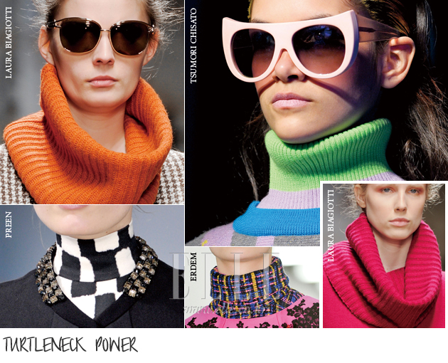 | 착용감이 편안한 터틀넥은 가을에 빠지지 않고 등장하는 단골손님으로 이번 시즌 역시 그 활약이 눈부실 전망이다. 달라진 점이 있다면 특유의 루스한 이미지를 벗고 한층 지적이고 세련돼졌다는 것. 이 같은 트렌드에 동참하고 싶다면 화이트 터틀넥에 주목할 필요가 있다. 세린느는 화이트 터틀넥을 빅 사이즈 아우터와 매치해 화이트 셔츠 못지않은 클린한 매력을 끄집어냈고, 드리스 반 노튼은 화려한 오리엔탈 프린트 의상과 스타일링했으니 참고하면 좋을 듯. 독특한 소재의 터틀넥 역시 빼놓을 수 없는데 에르뎀 컬렉션처럼 과감한 컬러의 트위드 소재 터틀넥에 실크, 울 등 서로 다른 패브릭을 대치하면 밝고 다채로운 가을 패션을 즐길 수 있을 것이다. 목을 한껏 감싸는 터틀넥이 답답하게 느껴진다면 단순히 목에 걸치기만 해도 시크한 스타일이 완성되는 스누드에 눈을 돌려볼 것. 베이식한 티셔츠나 아우터에 오프숄더 느낌으로 어깨까지 끌어내려 스타일링하면 사랑스러운 룩을 완성할 수 있을 테니. |
