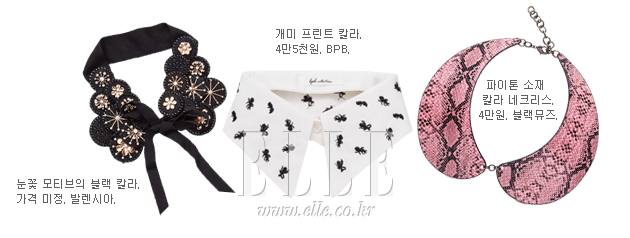 | 자칫 평범해 보일 수 있는 옷차림을 손쉽게 변신시키는 방법은? 내 맘대로 간편하게 ‘떼었다 붙였다’ 할 수 있는 탈착 칼라가 아닐까. 그동안 옷의 일부로만 여겼던 칼라가 이번 시즌 와일드 스킨부터 온갖 장식이 더해진 쿠튀르 칼라까지 변화무쌍한 디자인을 무기로 막강한 힘을 가진 잇 액세서리로 떠올랐다. 이를 증명이라도 하는 듯 최근 ‘국민 여동생’이라고 불리는 여자 연예인들 패션에서 빼놓을 수 없는 것 역시 ‘칼라’라는 사실. 뿐만 아니라 톱숍, 에이소스 등의 온라인 숍에서도 앞 다투어 다채로운 칼라 장식을 선보이고 있으니 올가을 칼라가 스트리트를 점령하는건 시간문제인 듯하다. 칼라의 매력에 흠뻑 빠진 디자이너들은 한층 업그레이드된 칼라 장식으로 런웨이를 물들였다. 로다테는 레이스 소재 칼라로 컬렉션 전체를 걸리시한 무드로 뒤덮었고, 도나 카란은 빳빳한 소재의 화이트 칼라로 모던한 시티 룩을 완성한 것. 조금 더 과감한 칼라 패션을 즐기고 싶다면 아퀼라노 리몬디 컬렉션처럼 터틀넥 위에 칼라를 더하는 센스를 발휘해 파워풀한 칼라 패션을 만끽해보자. |