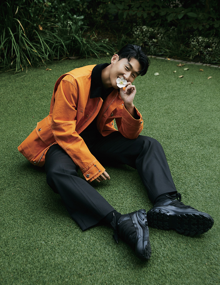 이마루 그를 만난 건 <이상한 변호사 우영우> 인기가 절정이던 늦여름. 우영우라는 주체적인 여성이 자폐인도, 보호받아야 할 존재도 아닌, 그저 자신일 수 있게 하는 로펌 송무팀 직원 이준호 씨에게 푹 빠져 있던 나는 배당표의 ‘강태오 화보’ 옆에 적힌 내 이름을 발견하자마자 사명감에 휩싸였다. 이 식물 같은 남자를 ‘초절정 섹시남’으로 포착해 내고 싶다는 거대한 욕망에 사로잡힌 것이다. 구멍이 숭숭 뚫린 니트와 붉은 조명, 가죽 소파까지 만만의 준비를 마쳤지만, 하얀 반팔 티셔츠에 청바지 차림으로 스튜디오에 들어선 그의 모습은 그 자체로 섹시함, 그 ‘잡채’였다. 쑥스러워하면서도 ‘나쁜 눈을 한 섹시남’ 컨셉트에 충실해 준 그의 진정한 섹시미는 바로 그 충실함에서 온다. ‘이제야 빛을 봤다’는 평가 뒤로 그간 배우로서 켜켜이 쌓아 올린 노력의 시간들과 캐릭터, 작품을 바라보는 사려 깊은 태도 말이다.