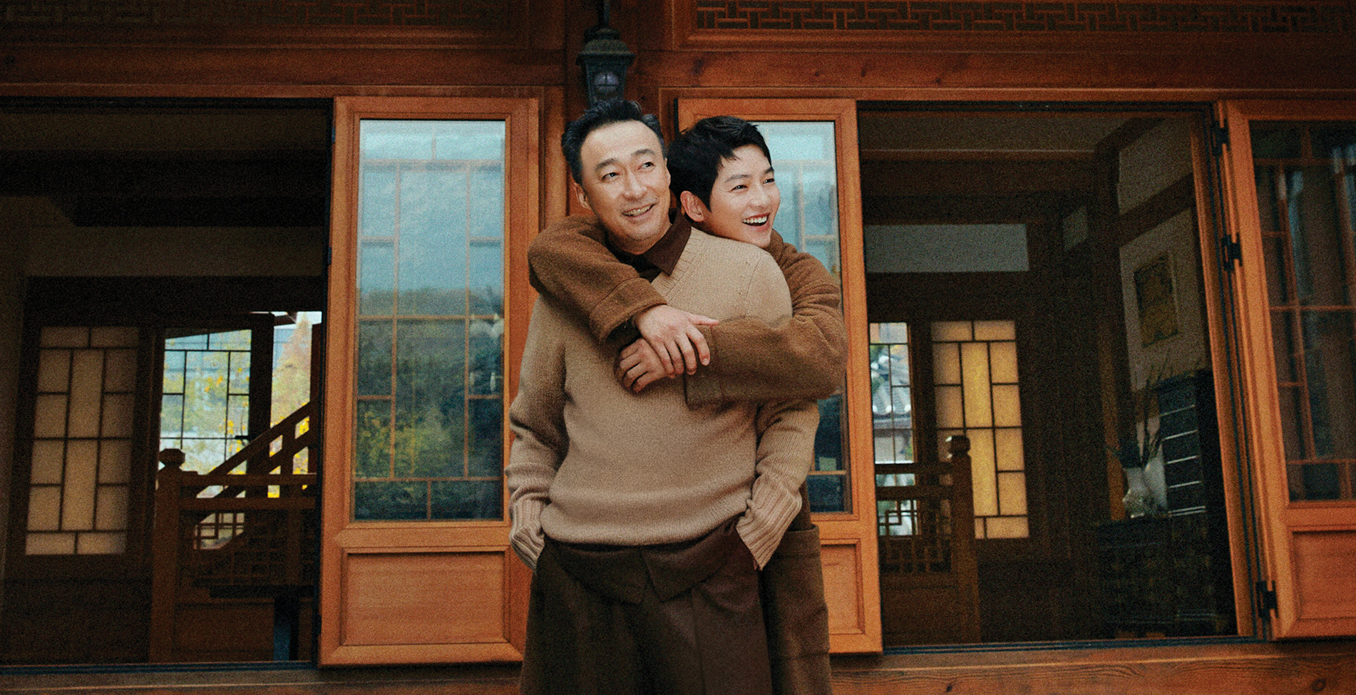 이성민이 입은 베이지 니트는 COS. 안에 입은 브라운 셔츠와 와이드 팬츠는 모두 Le 17 septembre. 화이트 스니커즈는 Hogan. 송중기가 입은 캐멀 터틀넥은 Tod’s. 울 트위드 팬츠는 Auralee. 부츠는 Carmina by Unipair. 로브 코트는 스타일리스트 소장품.