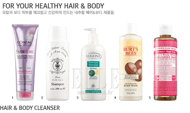1 건조하고 푸석한 모발을 위한 에버퓨어 샴푸. 250ml. 1만원. 로레알 파리. 2 손상된 모발의 섬유질을 복원시키는 샴푸. 샴포 라반다. 250ml. 7만8천원. 산타마리아 노벨라. 3 순한 식물성 세정 성분들로 이루어진 프리미엄 샴푸. 600ml. 6만5천원. 로고나. 4 내츄럴리 너리싱 밀크 앤 쉐어 버터 바디 워시. 350ml. 2만7천원. 버츠비 5 촉촉한 보디 샤워 젤. 로즈 퓨어 캐스틸 솝. 238ml. 1만3천원대. 닥터 브로너스. |