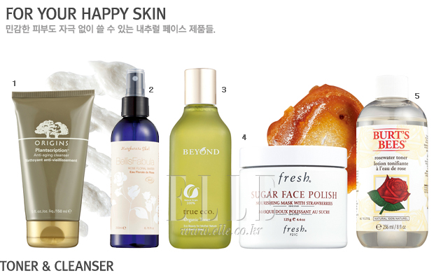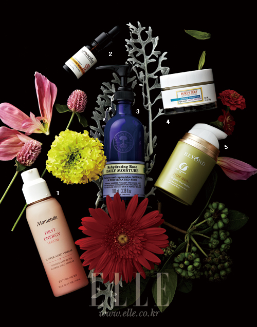 1 알로에베라, 귀리 등이 주성분인 플랜트스크립션 안티-에이징 클렌저. 150ml. 3만9천원대. 오리진스. 2 진정·수렴 효과가 있는 로즈 플로랄 워터. 200ml. 3만5천원. 마르게리타겔 by 온뜨레. 3 유기농 인증 원료가 72퍼센트 들어 있는 트루 에코 오가닉 토너. 150ml. 3만8천원. 비욘드. 4 비타민 C가 풍부한 스트로베리가 함유된 슈가 페이스 폴리쉬. 100ml. 10만2천원. 프레쉬. 5 유·수분의 밸런스를 맞춰주는 로즈워터 토너. 236ml. 3만6천원. 버츠비. |
