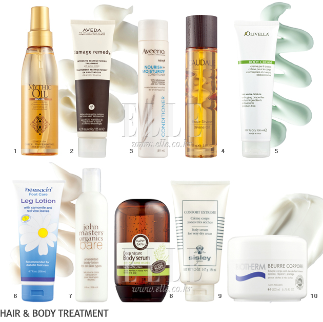 1 윤기 있는 모발을 위한 미틱 오일 리치 오일. 125ml. 3만원대. 로레알 프로페셔날 파리. 2 데미지 레미디 인텐시브 리스트럭쳐링 트리트먼트. 125ml. 3만9천원. 아베다. 3 수분 공급 효과가 탁월한 너리쉬 모이스처라이즈 컨디셔너. 311ml. 1만9백원. 아비노. 4 머리부터 발끝까지 사용 가능한 멀티 기능의 드라이 오일. 디바인 오일. 50ml. 가격 미정. 꼬달리. 5 100퍼센트 버진 올리브 오일이 함유된 바디 크림. 150ml. 2만7천원. 올리벨라. 6 팔과 다리의 피로 해소에 효과적인 풋케어 레그 로션. 200ml. 3만원. 허바신. 7 오가닉 식물 추출물이 함유된 베어-무향 바디 로션. 236ml. 3만4천원. 존 마스터스 오가닉스. 8 매끈하고 촉촉하게 발리는 딥 네이처 바디 세럼. 200ml. 1만6천원대. 해피바스. 9 건성 피부를 위한 초강력 보습 크림. 꽁뽀르 엑스뜨렘므 보디 크림. 150ml. 14만5천원. 시슬리. 10 끈적임 없는 고보습 바디 크림. 보꼬포렐 바디버터 크림. 200ml. 3만9천원. 비오템.