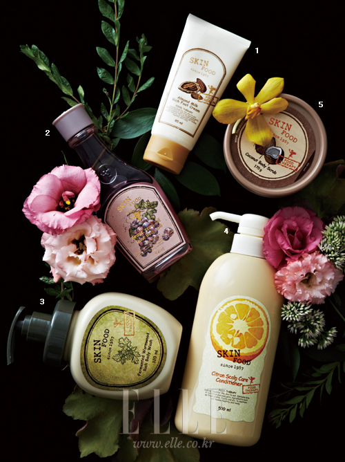 1 비타민 E를 다량 함유한 아몬드 추출물, 각질 제거와 보습 작용이 있는 우유 추출물이 함유된 아몬드 밀크 리치 풋 크림. 85ml. 6천7백원. 2 건조한 피부를 촉촉하고 탄력 있게 가꿔주는 포도씨 오일 듀얼 바디 오일. 160ml. 6천9백원. 3 메마르고 거친 보디 피부를 부드럽게 만들어주는 쑥 발효 리치 바디 워시. 320ml. 9천9백원. 4 두피와 머릿결을 윤기 있고 건강하게 지켜주는 유자 두피 케어 컨디셔너. 500ml. 9천원. 5 거칠어진 보디 피부를 매끈매끈 빛나는 피부로 바꿔주는 코코넛 바디 스크럽. 170g. 9천9백원. 모두 스킨푸드. |