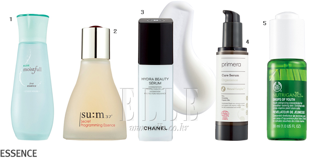 1 유기농 알로에가 함유된 수분가득 알로에 퍼스트 에센스. 100ml. 1만5천원. 에뛰드 하우스. 2 화사하고 탄력 있는 피부로 가꿔주는 시크릿 프로그래밍 에센스. 80ml. 8만원. 숨37. 3 뛰어난 수분감과 강력한 보습력을 발휘하는 이드라 뷰티 세럼. 30ml. 11만원. 샤넬. 4 발아 흑미의 풍부한 영양 성분이 농축된 오가니언스 큐어 세럼. 50ml. 3만2천원대. 프리메라. 5 피부를 부드럽고 유연하게 가꿔주는 뉴트리가닉스 드롭스 오브 유스. 30ml. 4만9천원. 더바디샵. |