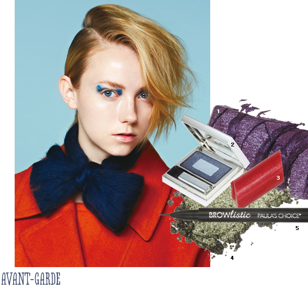 중성적인 분위기가 풍기는 아방가르드 스타일에는 톤 다운된 아이 컬러를 불규칙하게 바르는 아이 메이크업을 매치해보자. 마스카라 브러시로 눈썹 색깔을 모발 컬러에 맞춰 결을 살려 바른 다음, 브러시에 아이섀도를 묻혀 눈가에 자유롭게 톡톡 두드려 바르는 것. 넓게 펴 바르기보다는 앞머리나 꼬리 부분에 포인트를 주듯 바르는 것이 세련되며 속눈썹에 마스카라를 가볍게 바르면 완성된다.