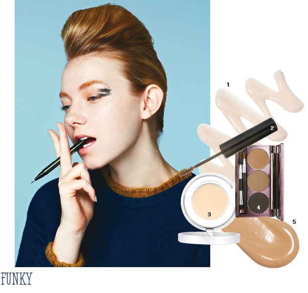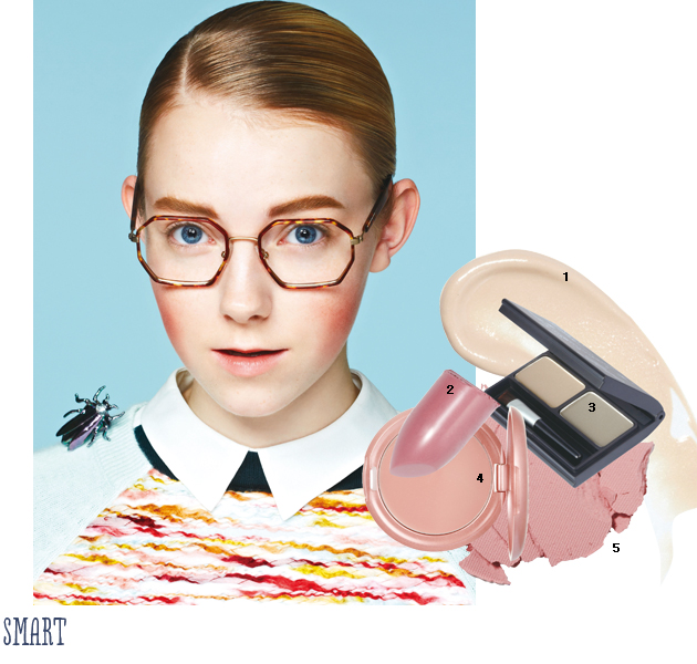 셔츠, 니트, 어깨에 얹은 곤충 모양 링. 모두 H&M. 안경. 그라지 by 옵티칼 더블유. 1 일루미네이팅 페이스 베이스 SPF 25 PA++. 30ml. 5만8천원. 바비 브라운. 2 드 라 루즈 RG22호. 3.5g. 1만5천원. 바닐라 코. 3 케익 아이브로우. 2×2g. 8천원. 다나한룩. 4 컨버터블 컬러 릴리움. 4.25g. 4만2천원. 스틸라. 5 올인원 치크 컬러 쉐이드 마시멜로. 4g. 1만7천원. 더바디샵.