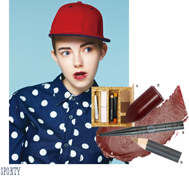 활동적인 스포티 룩에 어울리는 보이 메이크업의 핵심은 눈썹과 입술에 포인트를 주는 것. 눈썹 숱이 많다면 아이브로 마스카라를 이용해 앞머리를 위로 빗어 올려 결을 살려준다. 하지만 숱이 적은 편이라면 붓펜이나 펜슬을 이용해 눈썹 결을 만들어주고 브러시로 가볍게 문질러 자연스럽게 마무리. 립 컬러는 매트하게 마무리되는 다크 레드 계열의 포뮬러로 골라 손가락에 찍어 톡톡 두드려 바르면 된다.