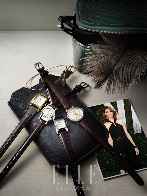 (왼쪽부터)가죽 밴드와 골드 케이스의 조화가 클래식한 워치는 Hybrid tea series, 49만8천원. 실버 다이얼과 버건디 컬러 스트랩이 조화로운 워치는 Antique Touch Rose Series, 42만3천원. 심플한 스퀘어 다이얼의 워치는 Milanese series, 42만8천원. 버클의 싱글 다이아 장식이 특징인 워치는 Antique Touch Rose Series, 38만4천원. 모두 로즈몽 워치 by 갤러리어클락. 악어가죽 소재의 파우치는 마이 분. 검은색 안경테는 린다 패로우 by 한독. 시계 밑에 놓인 휴대폰 케이스는 CK 캘빈클라인. 뱀을 형상화한 뱅글은 PRIYANKA by 퍼블리시드.