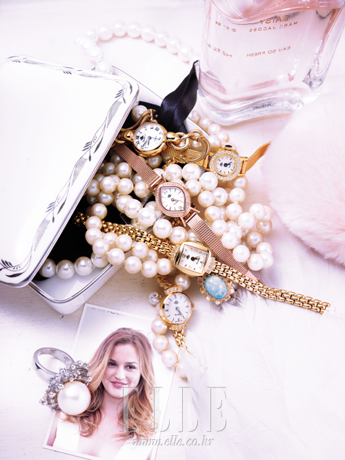 (위부터)14개의 크리스털이 파베 세팅된 브레이슬릿 스타일 워치는 Climbing Rose Series, 49만4천원. 라운드 형태로 크리스털이 촘촘히 세팅된 워치는 Miniature Rose Series, 69만8천원. 로즈 골드 도금의 워치는 Antique touch series, 64만5천원. 8개의 크리스털이 파베 세팅된 워치는 Antique Touch Rose Series, 59만8천원. 원형 다이얼에 크리스털 장식이 더해진 워치는 Antique Touch Rose Series, 59만8천원. 모두 로즈몽 워치 by 갤러리어클락. 진주 목걸이와 진주 반지는 모두 제이미&벨. |
