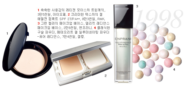 1998 two-way cake 진하고 두껍고 입체적인 메이크업의 유행이 지고 슬슬 내추럴 뷰티에 눈을 돌리게 된다. 아마 1997년 드라마 <사랑한다면>과 <아름다운 그녀>에서 선보인 심은하 표 뷰티 룩이 일등공신이 아니었을까? 때문에 간편하게 피부 표현을 끝낼 수 있는 투웨이 케이크가 필수 아이템이었다. 1998년 5월 호의 <엘르> 뷰티 기사를 보면 메이크업 아티스트 정샘물과 모델 박청숙, 이혜상이 입을 모아 ‘10분 내에 완벽하게 끝내는 초 스피드 메이크업’을 위해 투웨이 케이크를 일등공신으로 꼽고 있다. |