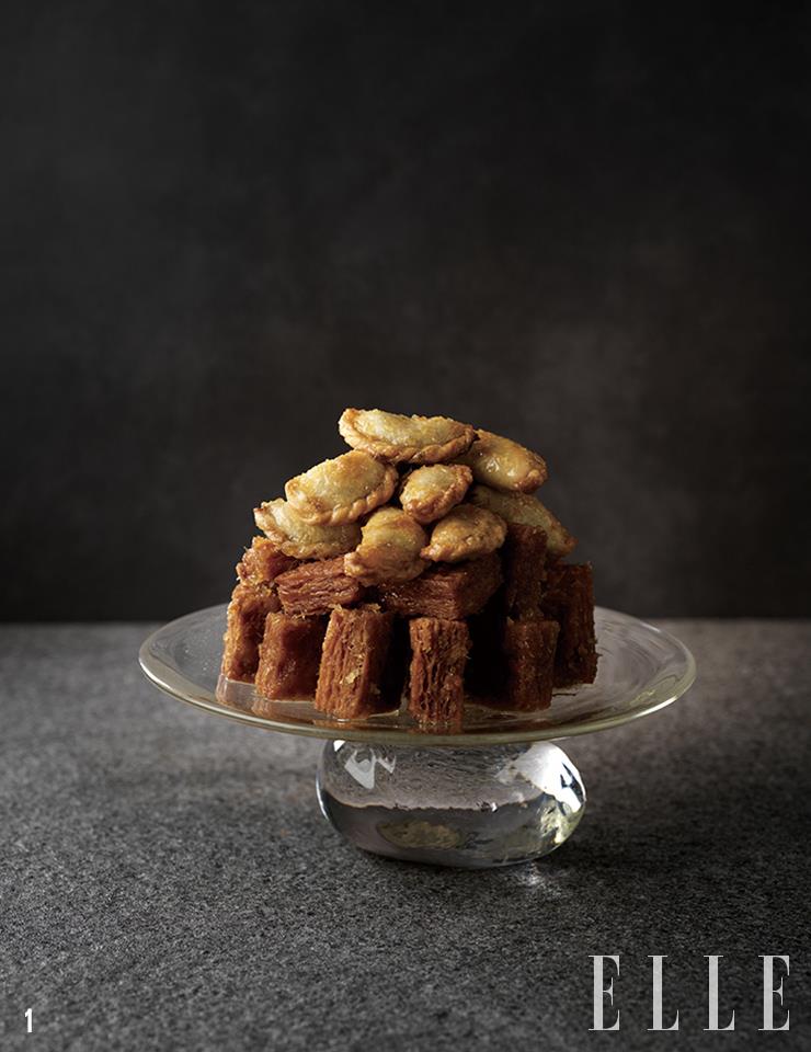 1, 3 밀가루에 참기름, 꿀, 술을 섞어 반죽한 것을 기름에 튀겨 집청한 유밀과. 궁중 음식이나 의례 음식으로 많이 쓰여 개성과 한양 지역에서 발전했다. 개성약과는 켜켜이 살아 있는 식감과 진한 생강 향이 특징이다. 만두과는 개성약과 반죽에 대추 소를 넣고 작은 만두 모양으로 튀긴 것이다. 2 궁중 음식과 반가 음식을 오랜 시간 전수받은 조은희 방장과 신라호텔 ‘서라벌’ 주방을 지켰던 박성배 수석연구원. 두 사람 모두 10년 가까운 시간 동안 온지음 맛공방에서 근무하고 있다.