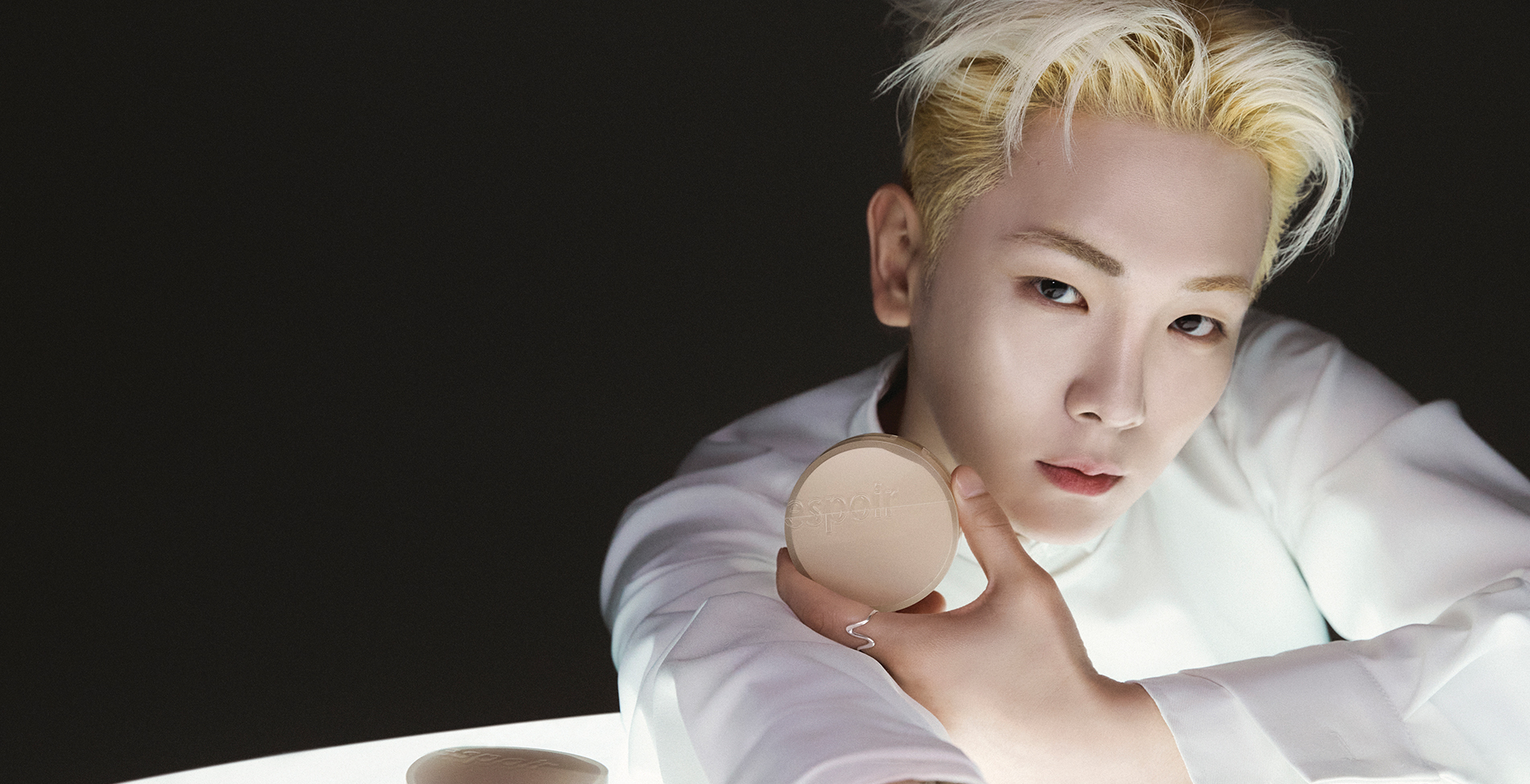 LIGHTS ON 깜깜한 어둠을 비추는 화이트 원형 오브제에 자연스럽게 걸터앉은 키. 그 자체로 빛이 나는 피부는 프로 테일러 비내추럴 쿠션으로 완성한 것. 사용 제품은 Espoir. 재킷은 스타일리스트 소장품. 팬츠는 Lemeteque. 슈즈는 Niwwtw. HAIR STYLIST LIM JUNG HO(BLOW) MAKEUP ARTIST KIM JOO HEE FASHION STYLIST KIM WOOK SET & PROP STYLIST HAN SONG YEE