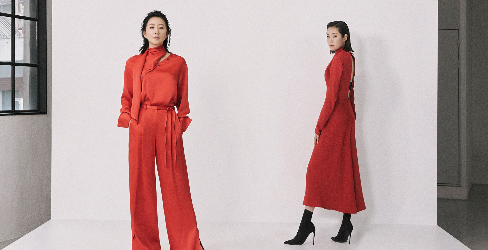 김희애가 입은 레드 실크 타이 블라우스와 실크 팬츠는 모두 Eudon Choi. 슬링백 스틸레토 힐은 Christian Louboutin. 문소리가 입은 레드 드레스는 La Silhouette de Eugenny. 슈즈는 Dolce & Gabbana.